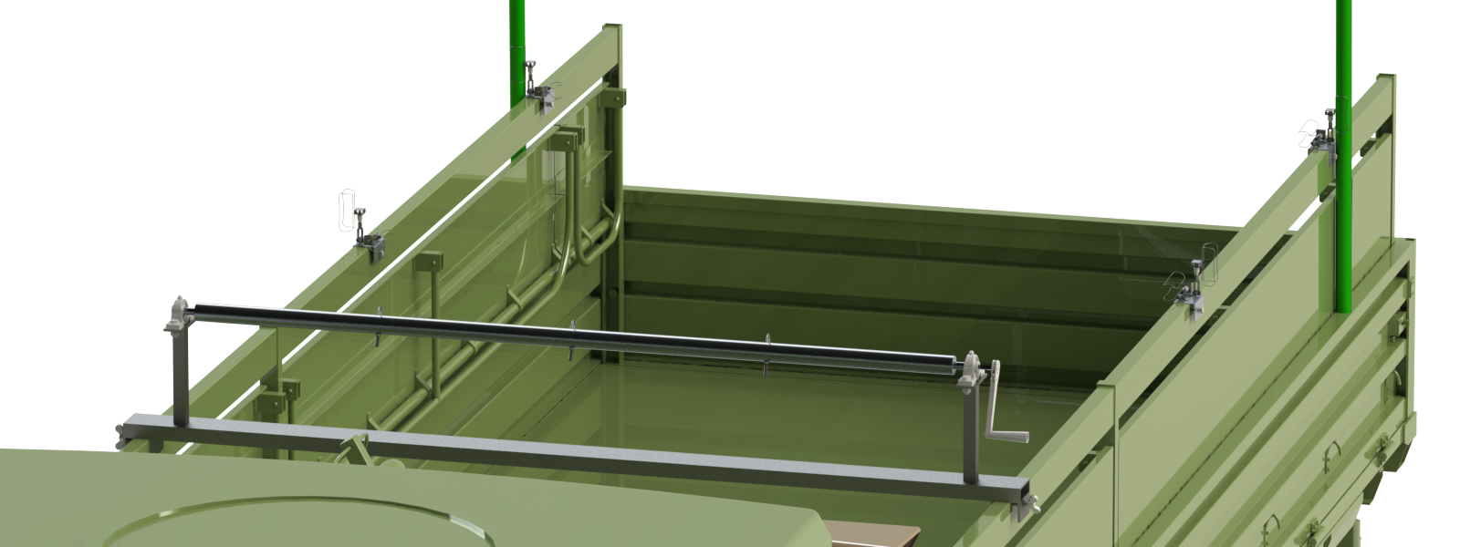 The team’s objective was to create a rapid deployable camouflage system that could be easily stored, transported, and deployed by a minimal number of soldiers in a short amount of time for the US Army. The current ULCANS system is comprised of netting, poles, and the use of a LMTV truck to set up the camouflage netting. Some major requirements given by the Army in terms of the design were that no permanent attachments were to be made to the vehicle, the concealment method would need to decrease the time used for deployment and rolling back up, and the design would need to withstand harsh conditions and misuse. Both the tarp and poles would need to be incorporated into the final design. To achieve the design objectives, background research was first done on the topic to determine patents and designs that were already on the market. Car covers, outdoor umbrellas, and awning rolling systems were researched and weighted based on price, useability, and relevance to the design objectives. Through multiple design iterations, a final roller design was selected along with a pole attachment method that allows for the poles to be attached to the side of the vehicle. The main features of the final design for the roller include a base plate that can rest on the bed of the truck. The roller drum fits horizontally across the bed and is connected to the base plate via bearing mounts. A shaft handle was added to the end of the roller to allow soldiers to easily roll up and roll out the tarp as necessary. The pole attachment design allows for 15 degrees of freedom and is comprised of thin wire-like clamps that allow the poles to easily slide in. These clamps can be attached to the sides of the truck.