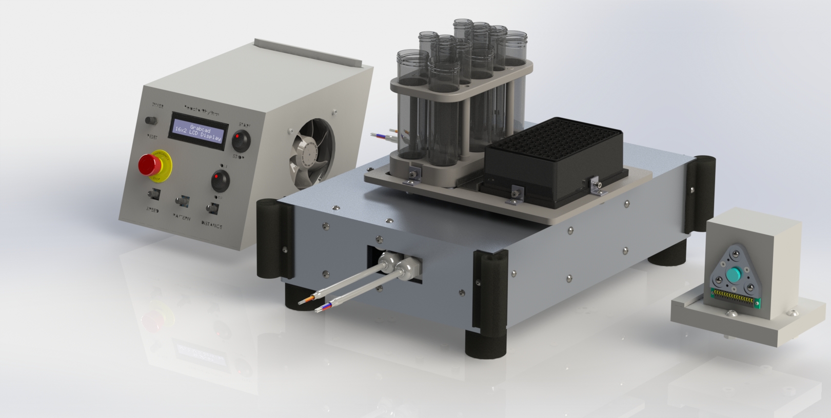 The goal of our design was to incorporate an easy-to-use user interface system, optimize the design, and powerfully drive a shaker table system. Our system is capable of operating at over 1000 rpms, which is accomplished using a dual-belt pulley system, driven by two stepper motors. The stepper motors are IP65 rated and implement encoders to ensure positional accuracy. Our high-power stepper motors and custom rail system are essential contributions to our power capability and are what differentiates us from competition. The HDPE body is mounted to the top of our shaking mechanism and supports six 15 mL and six 50 mL test tubes. In addition, there is an incorporated enclosure fabricated from sheet metal with rubber bumpers and feet to dampen falls and reduce vibrational movement. Our User Interface is a 3D printed PETG shell with an LCD display, which allows for mechanical control of parameters such as speed, distance, and pattern. Finally, for our OD/FI system, we have built-in LEDs secured under the well plate and tube racks that illuminate selected solutions on-command. Our sensor package is positioned to sense the optical density and fluorescent intensity of selected solutions via a robot arm.